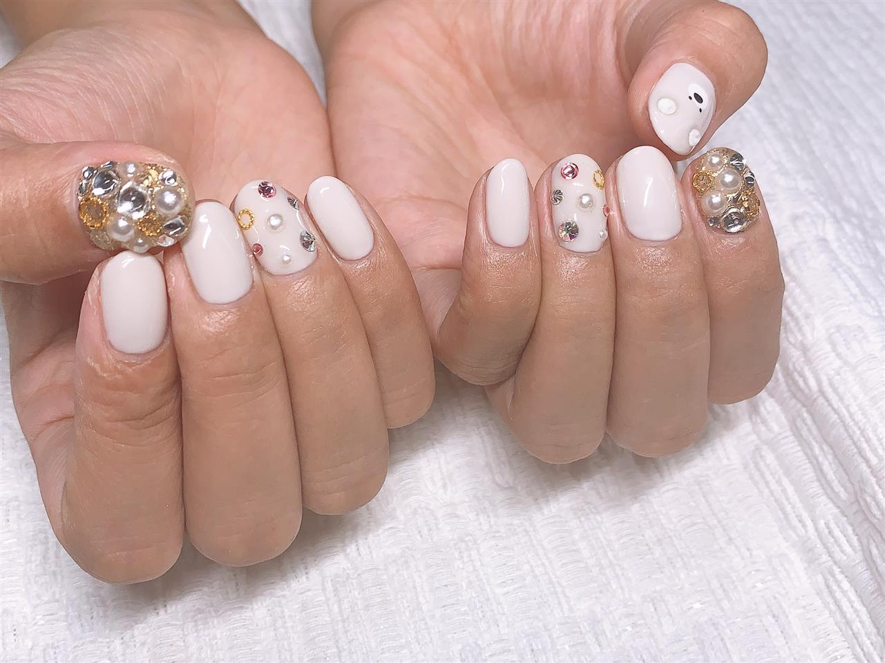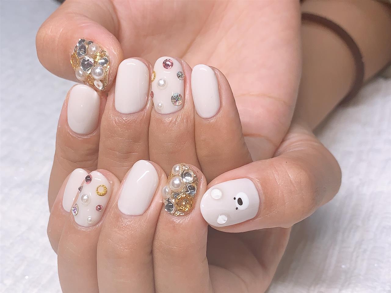 クリームカラーにストーン敷き詰めて親指にはクマさんを(*^^*)