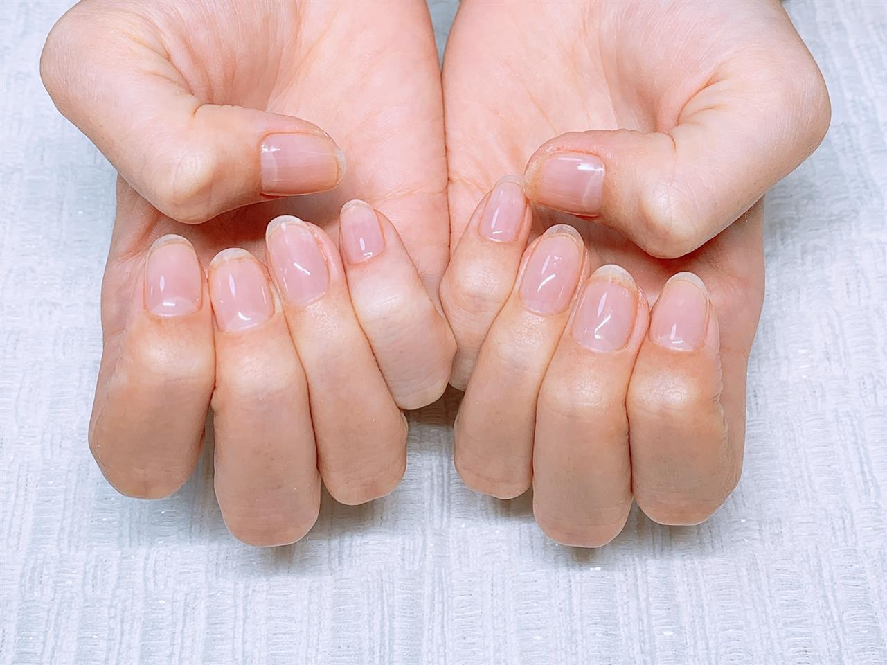 (でお湯で指先を温め甘皮処理・爪の長さ形整え・表面磨き・ハンドトリートメント仕上げ)